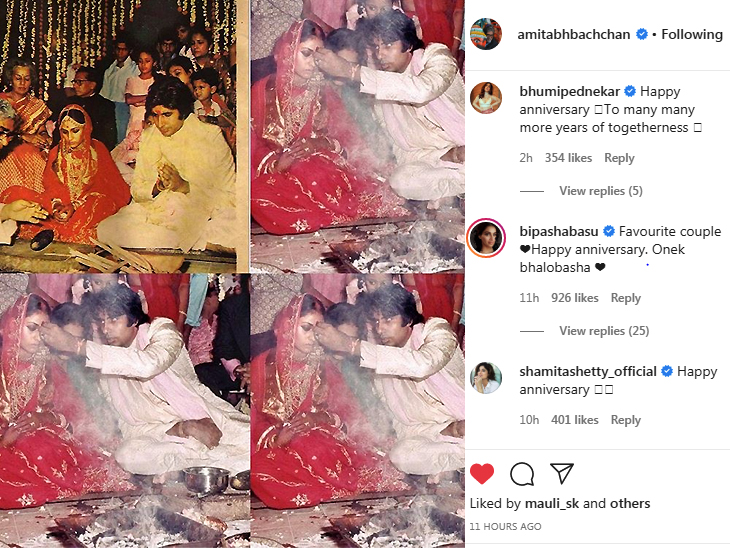 अमिताभ बच्चन की इस पोस्ट पर कमेंट करते हुए बॉलीवुड के कई कलाकारों ने भी उन्हें विश किया। बिपाशा बसु ने लिखा, 'पसंदीदा कपल। सालगिरह की शुभकामनाएं। ओनेक भालोबाशा।' भूमि पेडणेकर ने लिखा, 'हैपी एनिवर्सरी। एक साथ रहने के कई वर्षों के लिए शुभकामनाएं। इनके अलावा राजकुमार राव, मनीष पॉल, मृणाल ठाकुर, शमिता शेट्टी, आहना कुमार और ईशा देओल ने उन्हें विश किया।'